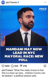 That dream and hope aren’t baseless. All signs point to its possibility and feasibility. When Zohran launched his campaign, he had only 1% of the support. However, he quickly rose to second place, behind Andrew Cuomo, albeit with a significant 25% gap. The gap eventually narrowed to 8% and then 2%. And as of yesterday, June 11, Zohran has taken the top spot, surpassing Andrew Cuomo by 3 percentage points in support.