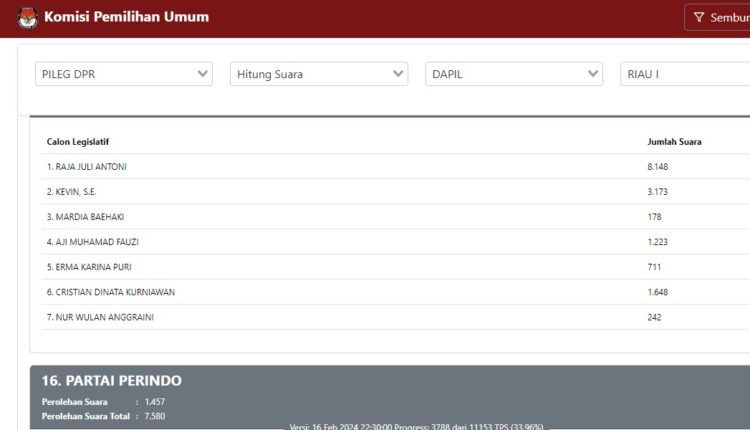 Pada data yang dapat diakses publik tersebut, data yang terkumpul baru 3827 dari 11153 TPS (34.31%). Raja Juli Antoni yang merupakan putra kelahiran Riau dari Kuansing saat ini menjabat sebagai Sekjen PSI. Pada daftar Caleg PSI untuk Dapil Riau 1, Raja Juli yang menyelesaikan pendidikan S3 di Australia ini menjadi yang terbanyak meraih suara, unggul diatas caleg PSI lainya yaitu Kevin, S.E., Mardia Baehaki Aji Muhamad Fauzi, Erma Karina Puri, Cristian Dinata Kurniawan dan Nur Wulan Anggraini.