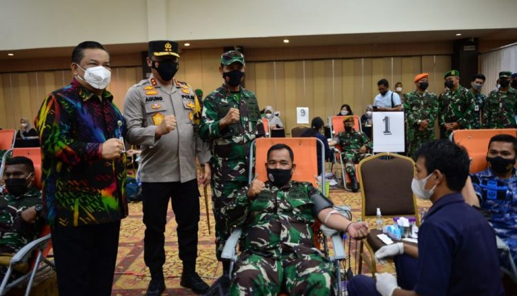 Sekda Riau SF Hariyanto menyapa peserta yang sedang melakukan donor darah. Selain itu juga memberikan semangat kepada para peserta yang ikut donor darah di ulang tahun TNI