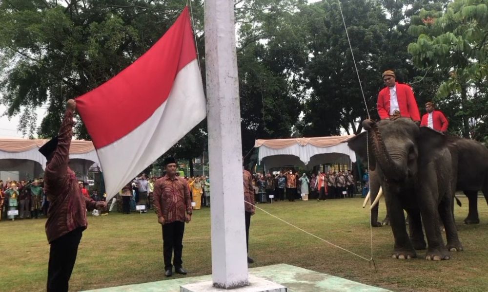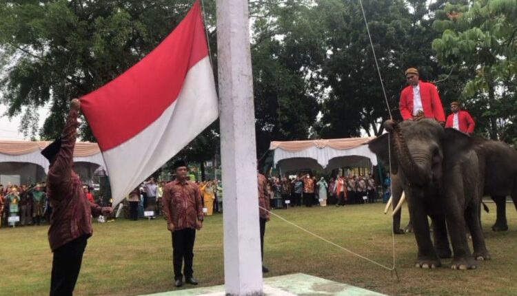 Pekanbaru-Tirastimes: – Tiga ekor gajah dilibatkan menjadi pengibar bendera merah-putih di lapangan upacara Kantor Balai Besar Konservasi Sumberdaya Alam (BKSDA) Riau, Kamis (17/8).
