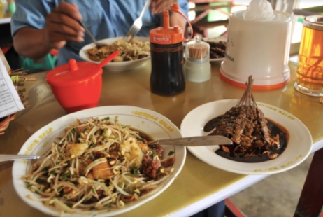 Kami pesan dua porsi, dan dalam hitungan menit pesanan datang. Sebelum saya makan, saya amati terlebih dahulu benda apa gerangan yang namanya lontong balap? Ternyata ada lontong beberapa potong, tauge (kecambah), tahu goreng yang sudah dipotong-potong, juga perkedel, dan disiram kuah kecap manis. Kuahnya seperti kuah tahu goreng ala Medan; terasa manis dan sedikit pedas, ya pedasnya orang Jawa tentu berbeda dengan pedas nya orang Sumatra. Lalu oleh teman saya disarankan untuk ambil beberapa tusuk sate kerang sebagai kawan makannya. Nah, itulah yang namanya lontong balap. Sayang, saya coba cari tahu tentang sejarah lontong balap tetapi taka da satu orang pun mengetahui dengan jelas asal nama lontong balap.