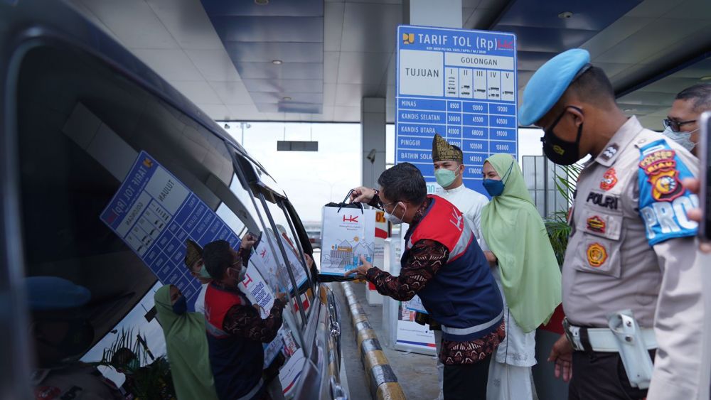 Adapun seremoni pembagian merchandise dilaksanakan di Gerbang Tol (GT) Pekanbaru, Ruas Pekanbaru – Dumai oleh Direktur Operasi III Hutama karya Koentjoro sekaligus menyapa pengguna jalan yang melintas dengan didampingi oleh Executive Vice President (EVP) Divisi Operasi & Pemeliharaan Jalan Tol Hutama Karya Dwi Aryono Bayuaji dan turut dihadiri pula oleh seluruh Branch Manager dari ruas tol yang dikelola oleh Hutama Karya.