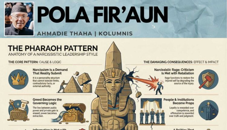 Pada sisi kiri diagram, pola kepemimpinan Fir‘aun dimulai dari tiga “akar psikologis dan logika kekuasaan”. Yang pertama adalah “narsisme yang menuntut realitas tunduk”. Dalam pola ini, seorang pemimpin tidak sekadar memiliki ego besar, tetapi menuntut agar dunia menyesuaikan diri dengan citra dirinya. Fakta yang bertentangan dianggap serangan pribadi. Kritik dianggap pemberontakan.