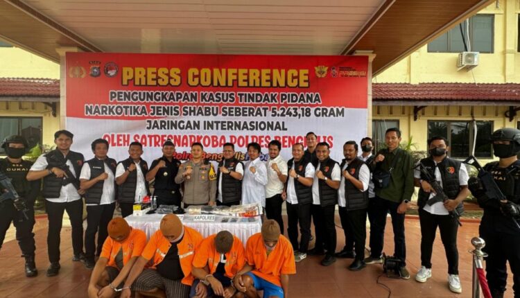 PEKANBARU-TIRASTIMES;-Satresnarkoba Polres Bengkalis menangkap empat pengedar narkoba jaringan internasional dan mengamankan sabu 5 Kg. Penangkapan para pelaku dilakukan pada Sabtu (11/11) ditiga lokasi berbeda.