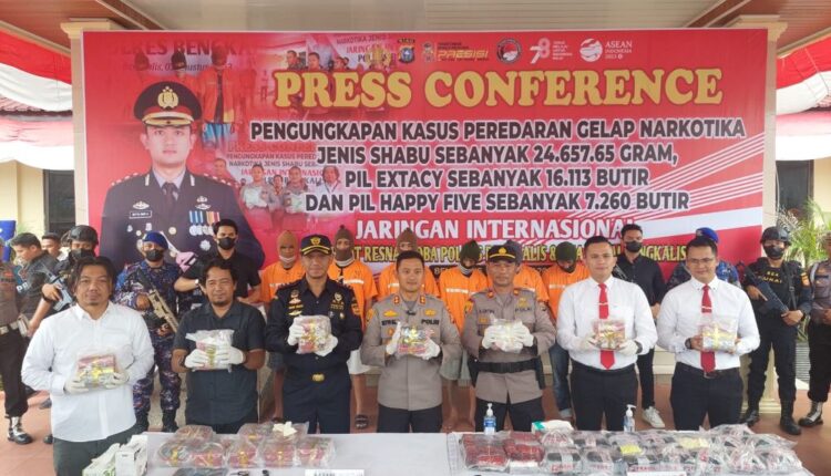 Pekanbaru-Tirastimes: – Polres Bengkalis menggelar ekspos pengungkapan kurir narkoba di Mapolres, dengan barang bukti 23 Kg sabu, 16.113 butir ekstasi dan pil Happy Five 726 papan berjumlah 7260 butir, di Mapolres pada Jumat (18/8).