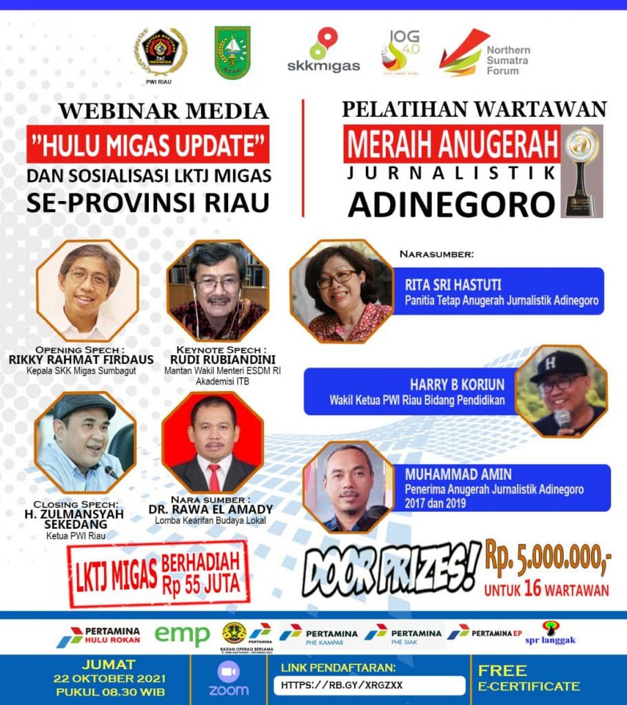 “Webinar ini akan dibuka Kepala SKK Migas Sumbagut, Bapak Rikky Rahmat Firdaus dan ditutup oleh Ketua PWI Riau. Pada Webinar Media ini juga akan disosialisasikan LKTJ Migas dengan total hadiah Rp55 juta,” terang Zulmansyah.