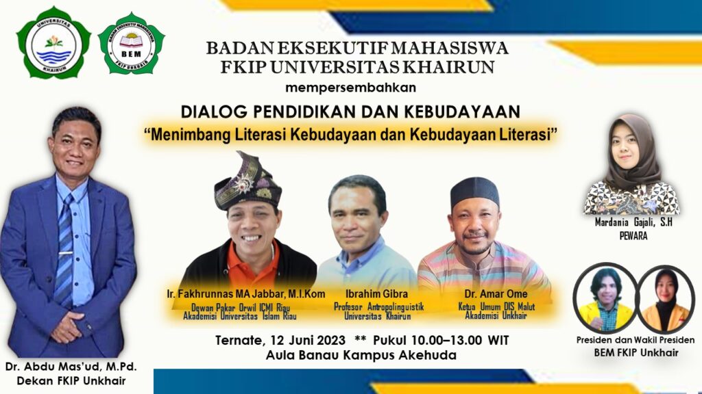 TERNATE-TIRASTIMES: Sastrawan Nasional anak jati Melayu Riau, Fakhrunnas MA Jabbar bakal tampil dalam Dialog Kebudayaan bertajuk “Menimbang Literasi Kebudayaan dan Kebudayaan Literasi” di kampus Universitas Khairun (Unkhair), Ternate. Acara Dialog yang ditaja oleh BEM FKIP Unkhair juga menampilkan Prof. Ibrahim Gibra yang dikenal juga sebagai Prof. Gufran Ali Ibrahim (Guru Besar Antropolinguistik) dan Dr. Amar Ome (Akademisi) Unkhair.