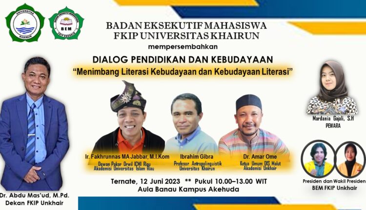 Ketua BEM FKIP Unkhair, Iskandar Din atau Isco, didampingi Wapres BEM, Suci Mulia, Ahad (11/6) di Ternate menjelaskan acara Dialog Kebudayaan ini sudah dipersiapkan sepekan lalu. Rencananya ada seratus undangan dari kalangan dosen dan mahasiswa akan hadir.
