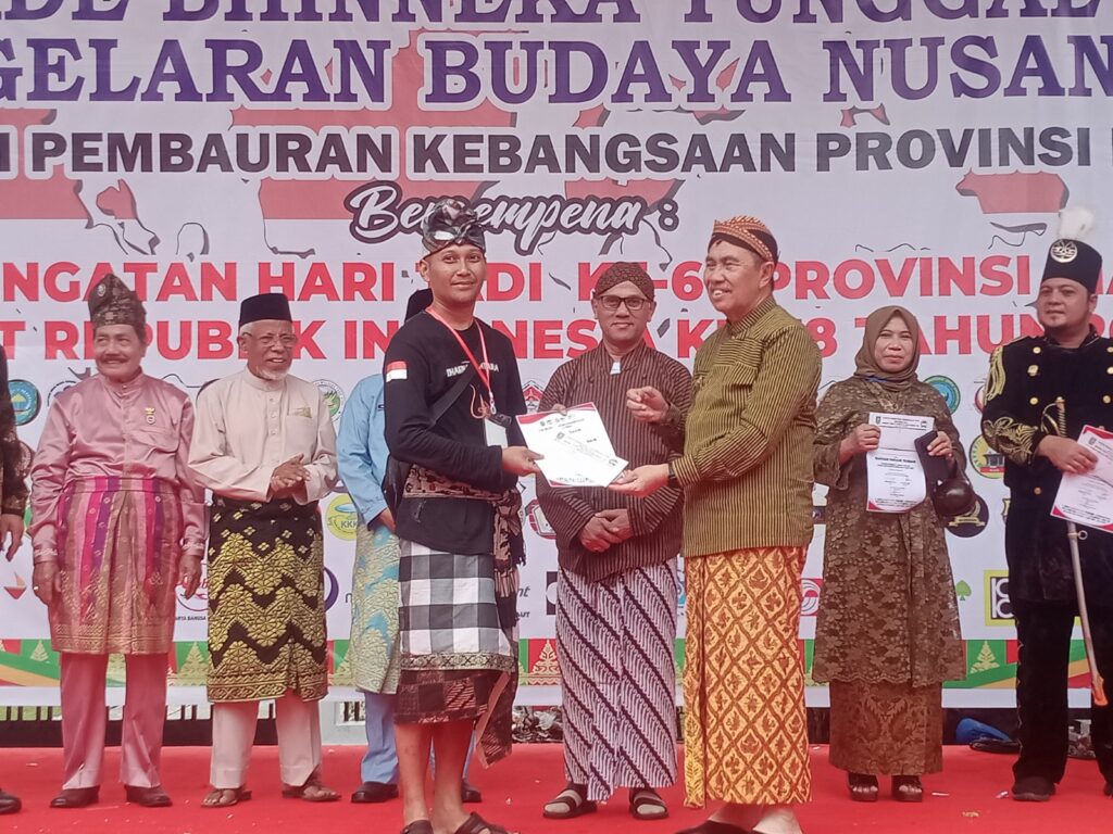 Pekanbaru-Tirastimes: – Semarak Parade Bhinneka Tunggal Ika dan Pagelaran Budaya Nusantara, Gubernur Riau (Gubri) Syamsuar tampil rapi kenakan baju surjan dan kain batik.
