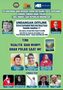 Diskusi secara online (layar zoom) peluncuran buku antologi puisi bersama “Swara-Swara Anak Pulau atau Ahli Waris Sah Republik Indonesia” akan dilaksanakan pada Kamis, 19 Juni 2025 pukul 19.15 WIB.
