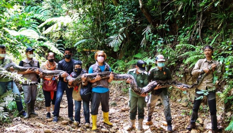Pekanbaru-Seekor ular sawah (Malayopython reticulatus/Python reticulatus) dengan panjang ditaksrkan 9 meter dan berat 120 kilogram (kg) dilepasliarkan ke habitatnya.